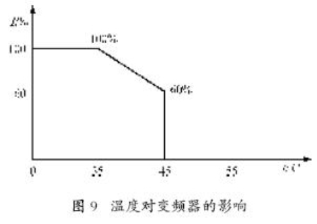 變頻器主要由各種電子元器件組成,它對于工作環(huán)境的要求較高,當(dāng)環(huán)境溫度超過它的最高工作溫度時,變頻器必然會降低其持續(xù)電流輸出的額定值,如圖9所示。