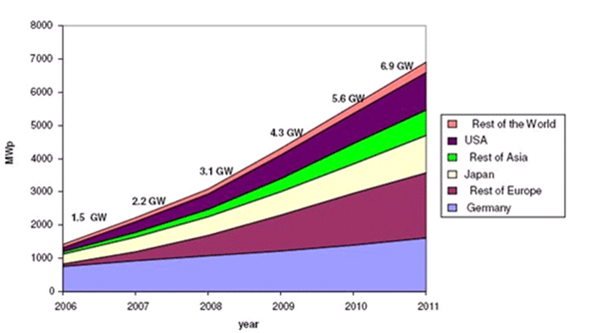 中國政府在《可再生能源長期規(guī)劃》提出,太陽能光伏發(fā)電裝機容量到2010年將發(fā)展到450MWp,而2005年全國太陽能發(fā)電裝機容量僅為6.5MWp,這就意味著中國太陽能裝機容量的復合增長率將會高達38%以上。了解目前太陽能光伏市場發(fā)展動態(tài),把握太陽能光伏行業(yè)發(fā)展趨勢,對于半導體行業(yè)的發(fā)展是至關重要的。