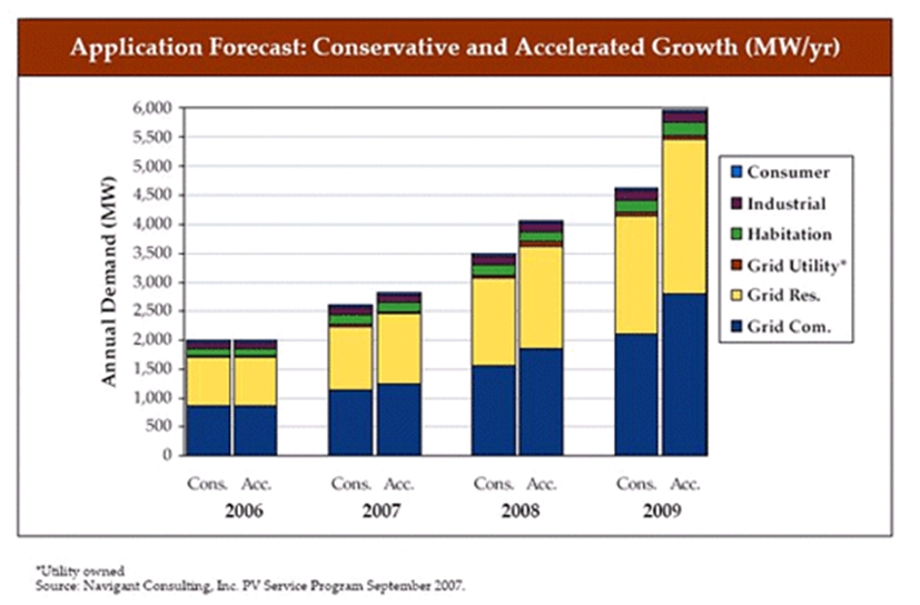 隨著全球能源需求的增長,大型和超大型并網光伏電站系統的建設已經在全球如火如荼地展開,它們發(fā)出的電能直接并入高壓輸電網絡,并可參與電力的輸送和調配,因此,是世界各國未來太陽能發(fā)電的重要發(fā)展方向。圖2所示為Navigant Consulting對未來幾年全球光伏市場發(fā)展趨勢的預測,其中可見,并網發(fā)電系統的增長最快。