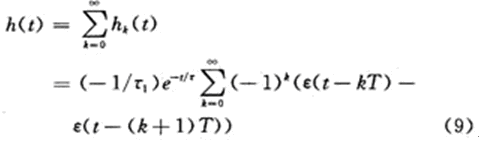 由式(8)可見(jiàn),第k段的非零值時(shí)區(qū)為(kT,(k+1)T_),即各時(shí)段非零值區(qū)間互不重疊,對(duì)hk(t)關(guān)于k求和,得開(kāi)關(guān)電容電路(對(duì)外)的單位沖激零狀態(tài)響應(yīng)h(t)為: