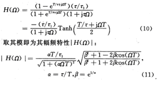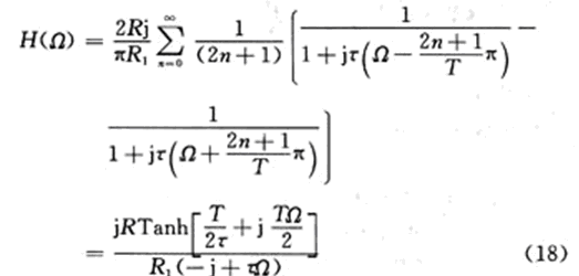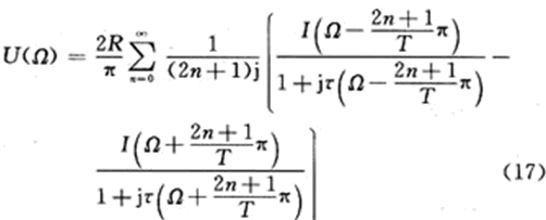 上式說(shuō)明,Ie(Ω)是輸入電流頻譜I(Ω)周期延拓的組合,周期為Ω0=2π/T。各電流分量流過(guò)RC并聯(lián)支路時(shí)的電壓為相應(yīng)電流分量與RC支路阻抗(R/(1+jωτ),ω=Ω±(2n+1)π/T)的乘積,于是輸出電壓頻譜U(Ω)為: