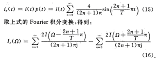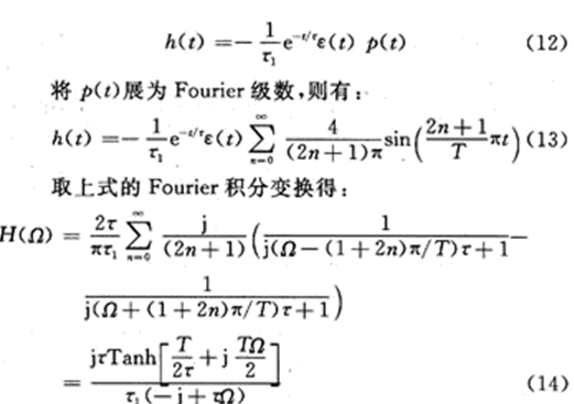 特別注意,求和式是一周期為2T的周期方波p(t)與單位階躍信號(hào)ε(t)的乘積,對(duì)上式取Fourier積分變換即得到開(kāi)關(guān)電容電路系統(tǒng)頻譜函數(shù)(用j表示虛數(shù)單位,下同):