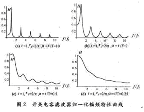 (4)隨著電子開(kāi)關(guān)切換周期2T增大(α減小),梳齒間谷底最小值逐漸增大。電路逐漸過(guò)渡為幅頻特性曲線輕微起伏的低通濾波器,如圖2(d)所示。低通濾波器傳輸函數(shù)極大值為: