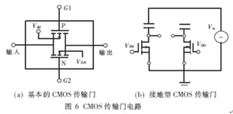 基本的CMOS傳輸門如圖6(a)所示。當傳輸門導通時,在輸入與輸出之間呈現(xiàn)低電阻,它允許電流向兩個方向中的任一方向流經此門。此時,輸入線的電壓必須比N溝器件的襯底電壓(VSS)為正,比P溝器件的襯底電壓(VDD)為負。這導致了傳統(tǒng)的CMOS傳輸門和以此為基礎構成的CMOS模擬開關難以適應大信號的傳輸[4~5]。