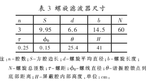 調頻范圍1.5M~3MHz;通帶中心插耗A0≤3dB;25dB帶寬△f25dB≥25kHz; 終端負載RS=RL=50Ω;傳輸功率P=100W。采用等元型螺旋濾波器設計法[6]確定的方腔螺旋腔濾波器腔數(shù)及尺寸見表3,測試結果見圖9、10及表4。