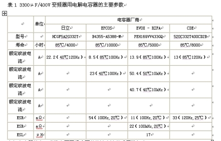 例如一個(gè)輸出功率為30kW的變頻器,整流濾波電容器可以采用四只3300μF/400V電解電容器兩串兩并實(shí)現(xiàn)。以通常認(rèn)為性能很好的日立變頻器用HCGF5A的電解電容器為例:40℃時(shí)的額定紋波電流為22.2A,而在85℃按日立公司的折算方法,對(duì)應(yīng)額定紋波電流將降低到8.2A,兩只并聯(lián)也不過(guò)是16.4A。不僅如此,壽命也僅能在85℃溫度下保證2000小時(shí)。而整流器的紋波電流就是接近60A!,加上逆變器的60A紋波電流,電解電容器間處于什么狀態(tài)?這兩個(gè)紋波電流即使按均方根值計(jì)算也將達(dá)到85A以上,是40℃下的額定電流的近4倍!這時(shí)的濾波電容器的壽命將會(huì)怎樣呢?