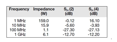表1:1000-pF旁路電容器的阻抗和求得的插入損耗。