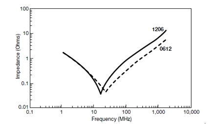 對(duì)于各類表面貼裝的不同封裝的電感值,可以利用方程2中所描述的測(cè)量技術(shù)來計(jì)算。例如,如果系統(tǒng)中產(chǎn)生了800MHz的噪聲,隨后可以在PCB上將其定位到一個(gè)確定的區(qū)域。選擇一個(gè)標(biāo)稱容量為39pF的電容,并將其安裝到盡可能靠近產(chǎn)生噪聲的地方,這對(duì)于減小EMI來說,將是最好的選擇。減小矩形芯片電感的一個(gè)有效方式就是改進(jìn)芯片縱長方向端頭的設(shè)計(jì)。所選電容器的阻抗曲線如圖4所示。注意通過改變縱橫比,寄生電感減小了大約50%,即從1200pH減小到600pH。這有效地偏移開了最大衰減點(diǎn),故在利用這些器件來進(jìn)行EMI濾波時(shí)只需牢記這一點(diǎn)。