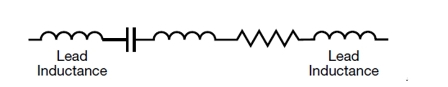引腳電容相對(duì)于表面貼裝電容器,除了增加了引腳之外,其他并沒有什么不同。其等效模型與MLCC模型一樣,除了增加了引腳所產(chǎn)生的電感之外,見圖5。