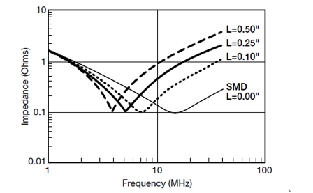 圖6;引腳長度對(duì)0.1 μF電容器的影響。