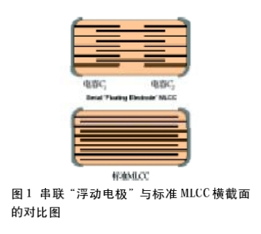 許多年前,人們發(fā)現(xiàn)在空氣中測(cè)試500VDC以上的電壓時(shí),MLCC標(biāo)準(zhǔn)設(shè)計(jì)的性能出現(xiàn)了問(wèn)題。有效層(active layer)之間的內(nèi)部擊穿和接線端之間的表面弧導(dǎo)致了故障的出現(xiàn)。為了解決電容器的有效區(qū)(active area)的電壓應(yīng)力問(wèn)題,制造商開(kāi)發(fā)出了一種串聯(lián)“浮動(dòng)電極”設(shè)計(jì),在單個(gè)元件內(nèi)有效集成了2個(gè)以上的電容器組。圖1是這類設(shè)計(jì)與標(biāo)準(zhǔn)MLCC的比較。