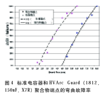 如同在前一部分中提到的那樣,焊接引線和涂層已廣泛用于生產(chǎn)高壓元件。除了引線外,引線框也可以用來(lái)封裝多個(gè)電容器,以得到更高的容量和增加符合性。盡管增加一個(gè)鷗翼型引線框會(huì)顯著增加元件的成本,但是它可以避免電路板彎曲的發(fā)生。直到最近,都沒(méi)有有效的方法來(lái)增加表面貼裝器件端點(diǎn)的符合性,但這個(gè)歷史已經(jīng)一去不復(fù)返了。通過(guò)在環(huán)氧聚合物端點(diǎn)上加上銀,可以防止電路板彎曲時(shí)發(fā)生的故障,進(jìn)而增加可靠性。這種選擇目前已用于我們的OMD-Cap范圍高壓系列設(shè)計(jì)以及HVArc Guard電容器。當(dāng)電路板彎曲時(shí),標(biāo)準(zhǔn)電容器與相同HVArc Guard電容器的聚合物端點(diǎn)的測(cè)試顯示的故障率差異如圖4所示。