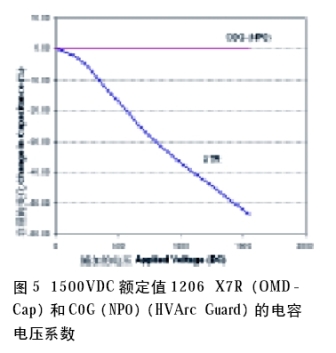 高壓電容器通常是采用X 7 R 和C0G 電解質(zhì)制造的。這些名稱描述了在-55~+125℃溫度系數(shù)將分別為美國(guó)電子工業(yè)協(xié)會(huì)(EIA)的±15%和±30×10-6/℃。C0G電容器也可以用更常用的術(shù)語(yǔ)表示,即NP0(正負(fù)零)。不過(guò),值得注意的是,在1kHz條件下以1Vrms進(jìn)行電容測(cè)量非常重要,各種材料可以用這些名稱來(lái)描述。對(duì)許多電源應(yīng)用來(lái)說(shuō),重要的是知道在某個(gè)具體電壓下的電容容量。X7R和C0G(NP0)電容器之間存在顯著的差異;施加了DC電壓的X7R電容器將釋放出大量容量,而C0G(NP0)電容仍然沒(méi)有太大的變化。出現(xiàn)這種現(xiàn)象是由于與C0G(NP0)電解質(zhì)的鐵電性質(zhì)相比,鐵電X 7 R 材料在剩余極化(remnant polarization)方面有根本的不同。實(shí)際上,雖然X7R MLCC具有高得多的容量,但是其容量在施加DC電壓時(shí)會(huì)顯著下降。這方面的一個(gè)例子如圖5所示。因此,當(dāng)采用多層電容器時(shí),設(shè)計(jì)人員必須考慮到施加電壓下的可用容量。