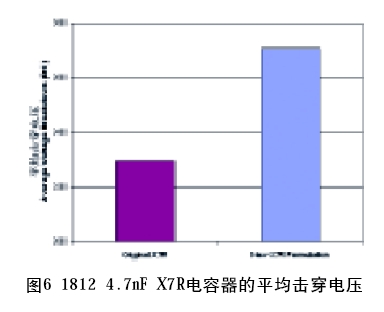 如前面敘述的那樣,有許多材料可以滿足X7R或C0G(NP0)的這類TCC要求。這些材料與各種設(shè)計(jì)的組合并不能在施加的DC電壓下以完全相同的方式實(shí)現(xiàn)。不同制造商任何給定電壓的可用容量一定會(huì)有很大的差異。較高的電壓可以與X 7 R 電解質(zhì)中的鐵電疇(ferroelectric domain)相耦合,在元件上產(chǎn)生一種機(jī)械應(yīng)力。這種“壓電應(yīng)力”會(huì)導(dǎo)致電容器在z方向上若干微米的移動(dòng)。當(dāng)然,這是根據(jù)壓電執(zhí)行器的原理,但是在MLCC的情況下,連續(xù)的電壓尖峰會(huì)導(dǎo)致應(yīng)力裂紋和故障。為了解決這個(gè)問(wèn)題,應(yīng)該使用這種具有降低壓電耦合能力的2000VDC 以上額定值的X7R電解質(zhì)電容器。降低耦合系數(shù)的影響可以增加擊穿耐壓,如圖6所示。這些設(shè)計(jì)采用了完全相同的有效厚度和“浮動(dòng)電極”型設(shè)計(jì)。唯一的差異在于X7R電解質(zhì)的新制劑方面的修改,它可以減少與施加電壓的耦合。這種新制劑已用于我們的高壓OMD-Cap產(chǎn)品線。