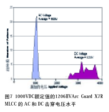 在許多應(yīng)用中,AC電源處理以及承受AC電壓的能力至關(guān)重要。測(cè)量這種能力的一種典型方法是在各種高頻條件下施加AC紋波電壓,直到電容器增加到超過(guò)環(huán)境溫度20℃以上。不過(guò),在X7R電容器與C0G(NP0)的電容器之間又一次出現(xiàn)了顯著的差異,前者的剩余電偶(remnant dipole)隨著施加的電場(chǎng)移動(dòng)而引起發(fā)熱,而后者在這種情況下的溫度不會(huì)增加。另一個(gè)AC 能力指標(biāo)是通過(guò)施加60Hz AC電壓,將其提升至6kV峰值30s 以上,直到發(fā)生電解質(zhì)擊穿而實(shí)現(xiàn)的。這種類型測(cè)試的結(jié)果可以與對(duì)1000VDC額定值的1206 X7R HVArc Guard電容器施加500Vdc/s的破壞測(cè)試的DC擊穿電壓相比,如圖7所示。D C 電壓故障的發(fā)生遠(yuǎn)遠(yuǎn)超過(guò)了1000VDC額定值。由于AC電壓故障發(fā)生在1000VAC左右,與DC電壓相比,故障的分布范圍很窄。