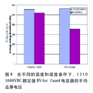 如前面提到的那樣,電容器或電路板涂層可以防止表面弧,而且還可以作為一種防潮的屏障。為了測(cè)試HVArc Guard元件對(duì)由濕度引起的故障的易感性,對(duì)1210外殼尺寸、1000VDC額定值的MLCC樣品進(jìn)行了擊穿電壓測(cè)試,其環(huán)境條件為23.8℃/53.3%RH,提高的溫濕度為85℃/85%RH。其結(jié)果如圖8所示。盡管在85/85條件下X7R的平均擊穿電壓相當(dāng)?shù)停獵0G(NP0)幾乎不受影響。因此,C0G(NP0)看似不那么易受潮濕所引起故障的影響,而兩種情況的擊穿都是在容許范圍以內(nèi),即使是在高濕度條件下。兩種環(huán)境條件下測(cè)試的元件擊穿范圍均高于額定電壓。