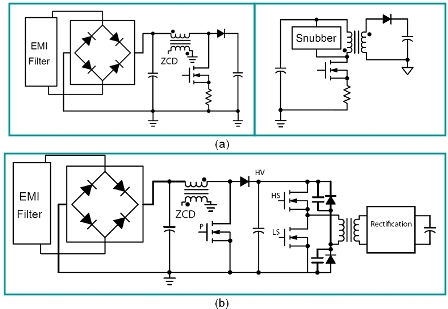 如前所述,一旦功率大于75 W,除了滿足上述工作能效及空載能耗要求外,電路中還面臨著加入PFC的要求,這在改善功率因數(shù)、使電網電能得到更高效利用的同時,也會使得電路結構更為復雜。在這類應用中,傳統(tǒng)電源架構是PFC+PWM的兩段式架構,即在非連續(xù)導電模式(DCM)或臨界導電模式(CrM)段后跟隨著準諧振反激段,每個段都使用一個控制器,如圖2(a)所示。