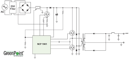 與這種兩段式架構不同,近年來涌現(xiàn)出一種新穎的單段式PFC架構,如安森美半導體新推的一款組合控制器NCP1901。它在單顆IC中結合了CrM PFC和半橋諧振轉換段,能夠提供實現(xiàn)高能效、小外形因數(shù)筆記本適配器所需的全部功能,如圖2(b)所示。這種架構使用的元器件數(shù)量更少,為兩段式架構提供了良好的替代選擇。