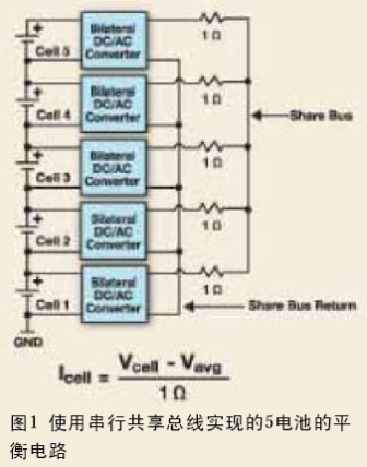 改善這種狀況的方法被稱為平衡。平衡是強(qiáng)制所有電池具有相同電壓的過程。這是通過平衡電路實(shí)現(xiàn)的。Aeroflex 平衡電路使用共享總線,這個總線的電壓等于所有電池的平均電壓。平衡電路由那些超過共享總線電壓的電池充電并將電能注入到電壓較低的電池,這個工作是通過高效率的雙邊DC/AC轉(zhuǎn)換器來完成的。平衡電流的大小與電壓差成正比,也就是說,隨著電池越來越接近理想平衡狀態(tài),平衡電流將趨近于0。圖1顯示了一個用于5個電池的平衡電路,其中,1 Ω電阻確定了傳輸比,也就是不平衡電壓與平衡電流的比值。對于容量較大(通常20Ah或更高)的電池而言,為了將達(dá)到平衡的時間減到最短,需要高達(dá)1A的平衡電流。對這些應(yīng)用而言,雙DC/AC轉(zhuǎn)換器電路通過平面變壓器工作在100kHz的頻率附近。