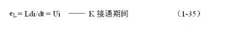 式中Ton為控制開關(guān)K接通的時間。當圖1-11-a中的控制開關(guān)K由接通狀態(tài)突然轉(zhuǎn)為關(guān)斷時,儲能電感L會把其存儲的能量(磁能)通過反電動勢進行釋放,儲能電感L產(chǎn)生的反電動勢為: