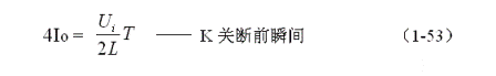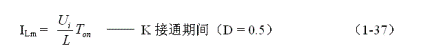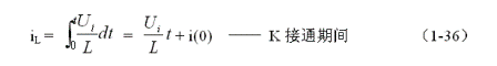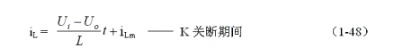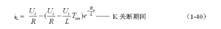 (1-44)式中iL為流過儲能電感L電流的瞬時值,t為時間變量;i(0)為的初始電流,即:控制開關(guān)K接通瞬間之前,流過儲能電感L中的電流。當開關(guān)電源工作于臨界連續(xù)電流狀態(tài)時,i(0) = 0 ,由此可以求得流過儲能電感L的最大電流為: