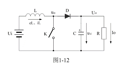 當控制開關(guān)K接通時,輸入電源Ui開始對儲能電感L加電,流過儲能電感L的電流iL開始增加,同時電流在儲能電感中也要產(chǎn)生反電動勢eL;當控制開關(guān)K由接通轉(zhuǎn)為關(guān)斷的時候,儲能電感也會產(chǎn)生反電動勢eL。eL反電動勢的方向與開關(guān)K關(guān)斷前的方向相反,但與電流的方向相同,因此,在控制開關(guān)K兩端的輸出電壓uo等于輸入電壓Ui與反電動勢eL之和。