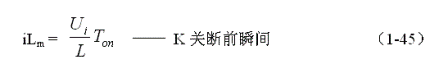 式中i(Ton+)為控制開關(guān)K從Ton轉(zhuǎn)換到Toff的瞬間之前流過電感的電流,i(Ton+)也可以寫為i(Toff-),即:控制開關(guān)K關(guān)斷或接通瞬間,之前和之后流過電感L的電流相等。實際上(1-47)式中的i(Ton+)就是(1-45)式中的iLm,因此,(1-9)式可以改寫為: