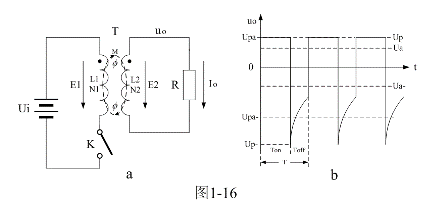 圖1-16-a是單激式變壓器開關(guān)電源的最簡單工作原理圖。圖1-16-a中,Ui是開關(guān)電源的輸入電壓,T是開關(guān)變壓器,K是控制開關(guān),R是負(fù)載電阻。
