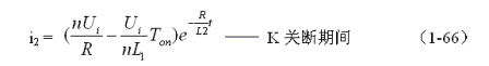 式中C為常數(shù),把初始條件代入上式,就很容易求出C,由于控制開關(guān)K由接通狀態(tài)突然轉(zhuǎn)為關(guān)斷時,變壓器初級線圈回路中的電流突然為0,而變壓器鐵心中的磁通量 不能突變,因此,變壓器次級線圈回路中的電流i2一定正好等于控制開關(guān)K接通期間的電流i2(Ton+),與變壓器初級線圈回路中勵磁電流被折算到變壓器次級線圈回路電流之和。所以(1-65)式可以寫為: