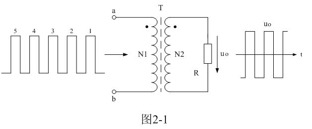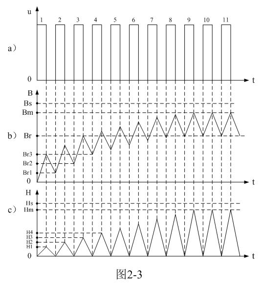 在圖2-1中,當(dāng)有直流脈沖電壓輸入變壓器初級(jí)線圈a、b兩端時(shí),在變壓器初級(jí)線圈中就有勵(lì)磁電流流過,勵(lì)磁電流會(huì)在變壓器鐵芯中產(chǎn)生磁通