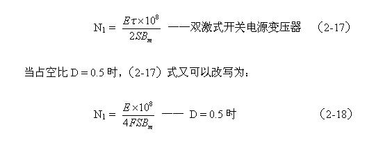 (2-18)式雖然是用于計(jì)算雙激式開關(guān)電源變壓器初級(jí)線圈N1繞組匝數(shù)的公式,但只需把式中的某個(gè)別參數(shù)稍微進(jìn)行變換或修改,同樣可以用于計(jì)算其它波形電源變壓器初級(jí)線圈匝數(shù)的公式。