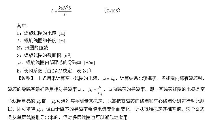【說明】上式是用來計算多層線圈繞組、截面為圓形的空心線圈的電感計算公式。長岡系數(shù)k可查閱表2-1,系數(shù)c可查閱表2-2。當(dāng)線圈內(nèi)部有磁芯時,有磁芯線圈的電感是空心線圈電感的