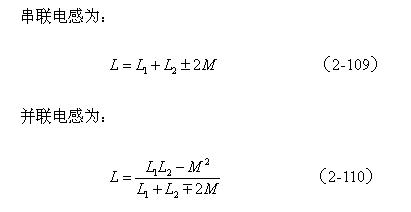 【說明】互感M有正負(fù),圖2-40-a和圖2-40-c的接法互感M為正,圖2-40-b和圖2-40-d的接法互感M為負(fù)。兩個線圈之間的互感M為: