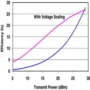 動(dòng)態(tài)/可適性電壓調(diào)整技術(shù)(DVS/AVS)與高整合度組件所使用的方式很類似,它會(huì)把閉回路系統(tǒng)中的處理器和穩(wěn)壓器連結(jié)在一起,并在確保系統(tǒng)正常工作的情形下,將數(shù)字電源供應(yīng)的輸出電壓動(dòng)態(tài)調(diào)整至最小值。功率放大器會(huì)被最佳化,使它在最大傳送功率下?lián)碛凶罡咝?。由于絕大多數(shù)手機(jī)都在基地臺(tái)附近工作,手機(jī)的無線電功能會(huì)在維持通訊質(zhì)量的前題下,將傳送功率降至最低水平。當(dāng)功率放大器在較低的功率水平下工作時(shí),它的效率會(huì)受到影響,從(圖三)可以看出,利用動(dòng)態(tài)電壓調(diào)整技術(shù)來調(diào)整功率放大器的電壓,它的工作效率會(huì)增加10%至20%。