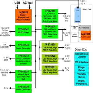 在這個(gè)解決方案中,就算鋰離子電池下降至3.3V左右,在100%負(fù)載周期模式下工作的高效率TPS62200降壓轉(zhuǎn)換器仍能提供3.3V的I/O電壓。上述所有零件都采用SOT-23封裝,除了bq24020電池充電組件、TPS61020升壓轉(zhuǎn)換器以及TPS61042白光二極管驅(qū)動(dòng)組件之外,它們是采用3×3平方厘米的QFN封裝。TPS61040和TPS61042還內(nèi)建上端FET晶體管,每顆組件只需要一個(gè)外接二極管。bq24020、TPS622xx、TPS61020和線性穩(wěn)壓器組件全都內(nèi)建FET晶體管,功率放大器和中央處理器電源采用的動(dòng)態(tài)電壓調(diào)整技術(shù)可以提高每顆零件的效率,進(jìn)而協(xié)助降低功耗。