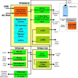 在此解決方案中,3.3VI/O電源是由SEPIC轉(zhuǎn)換器提供,它讓應(yīng)用系統(tǒng)能充份利用鋰離子電池電力,直到電池電壓降至最低水平(大約2.7V)。和離散解決方案一樣,穩(wěn)壓器輸出也來自3.3V輸入電源,以便提高工作效率。TPS65010采用48只接腳QFN封裝,這些組件都內(nèi)建FET晶體管。TPS61130SEPIC轉(zhuǎn)換器采用4×4平方厘米QFN封裝,并且內(nèi)建FET晶體管,最高達(dá)到90%以上效率,TPS5100則是三通道輸出控制器,專門用來提供電源給顯示器。功率放大器和中央處理器電源使用的動(dòng)態(tài)電壓調(diào)整技術(shù)可以改善每顆零件的效率,進(jìn)而協(xié)助降低功耗。
