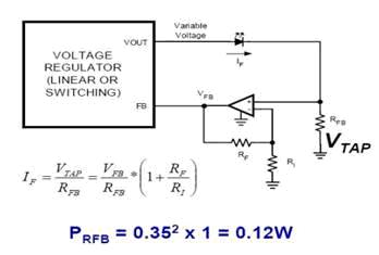 考慮運算放大器本身的功耗,RFB及其附屬電路的功耗大約為1WLED功率的12%。這樣就能在確保LED獲得恒流供電的同時,將RFB的功耗降低到可以接受的水平,從而使LED兩端的電壓盡可能大,流經(jīng)的電流也盡可能大。國家半導體按照這個原理工作的穩(wěn)壓器有LM2736和LM2734。