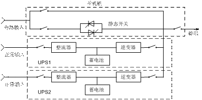 目前,為了提高UPS的可靠性,主要采用主從結(jié)構(gòu)的UPS“1+1”并聯(lián)備份,如圖4所示。雖然這樣在一定程度上提高了供電可靠性,但是不便于離線維護(hù)、擴(kuò)容,同時(shí)也造成設(shè)備利用不充分、缺乏靈活性等方面的缺陷。對(duì)于一些不能夠停電的用戶(例如醫(yī)療、銀行、金融、通信、國(guó)防等行業(yè)),UPS“1+1”并聯(lián)備份,還是存在很大的電力系統(tǒng)癱瘓隱患。