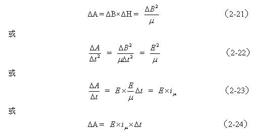 在圖2-12中,ΔA是在變壓器鐵芯磁滯回線中任意取出來(lái)進(jìn)行分析的面積,ΔA面積的取值可以任意的小,以保證在此面積中變壓器鐵芯的導(dǎo)磁率可以看成是一個(gè)常數(shù)。與ΔA面積對(duì)應(yīng)的有磁感應(yīng)強(qiáng)度增量ΔB和磁場(chǎng)強(qiáng)度增量ΔH以及時(shí)間增量Δt。根據(jù)磁場(chǎng)強(qiáng)度、磁通密度的定義,以及電磁感應(yīng)的定理,可以列出下面關(guān)系試關(guān)系式: