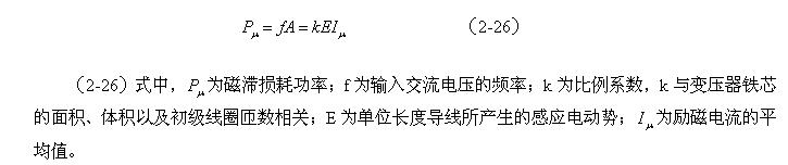 (2-25)式中,A為一個(gè)周期內(nèi)變壓器鐵芯的磁滯損耗,單位是焦耳;E為單位長(zhǎng)度導(dǎo)線所產(chǎn)生的感應(yīng)電動(dòng)勢(shì),單位為伏; 為勵(lì)磁電流的平均值,單位為安培;T為輸入交流電壓的周期,單位為秒,f為脈沖頻率,或開(kāi)關(guān)電源的工作頻率,單位為赫芝;k為比例系數(shù),它是一個(gè)與選用單位制和變壓器鐵芯面積、體積以及初級(jí)線圈匝數(shù)等參數(shù)相關(guān)的常量。在(2-21)、(2-22)、(2-23)、(2-24)式中,沒(méi)有比例系數(shù)k,是為了使問(wèn)題簡(jiǎn)單,便于分析。