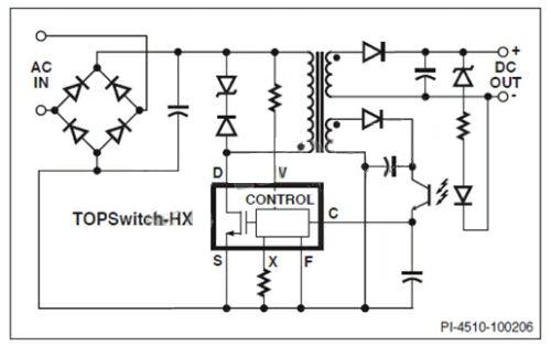 TOPSwitch-HX在單個(gè)IC封裝中集成了一個(gè)700VMOSFET、MOSFET柵極驅(qū)動(dòng)和一個(gè)用戶可選擇限流點(diǎn)的PWM控制器。在使能狀態(tài)下,控制器的振蕩器在每個(gè)時(shí)鐘周期開(kāi)始時(shí)導(dǎo)通功率MOSFET。當(dāng)電流達(dá)到限流點(diǎn)或達(dá)到反饋信號(hào)設(shè)置的占空比(PWM控制)時(shí),MOSFET才會(huì)關(guān)斷。PWM控制器關(guān)斷MOSFET后,變壓器繞組間的電壓開(kāi)始反向,輸出二極管被正向偏置,電流開(kāi)始流入次級(jí)繞組,從而補(bǔ)充輸出電容中的電荷并將電流供應(yīng)給負(fù)載。