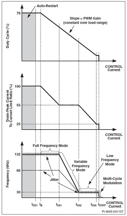 隨著輸出負(fù)載的降低,TOPSwitch-HX控制將切換至變頻模式(VFM)。在此模式下,功率MOSFET峰值漏極電流將保持不變,同時(shí)開(kāi)關(guān)頻率會(huì)從132kHz的初始全頻(或66kHz,取決于用戶的選擇)下降到30kHz。占空比隨著負(fù)載的降低而減小,這一過(guò)程通過(guò)延長(zhǎng)開(kāi)關(guān)脈沖之間的關(guān)斷時(shí)間來(lái)完成。開(kāi)關(guān)頻率的降低導(dǎo)致開(kāi)關(guān)損耗下降,并可在負(fù)載降低時(shí)維持電源效率恒定不變。