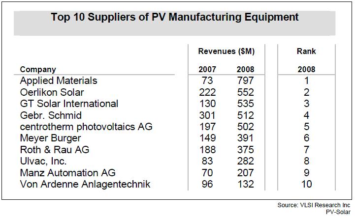 VLSI Research的數(shù)據(jù)顯示,Applied Materials全年晶體硅太陽(yáng)能設(shè)備和薄膜太陽(yáng)能設(shè)備收入總和達(dá)到了7.97億美元,超過(guò)了排在第二位的Oerlikon Solar,該公司收入額為5.52億美元。