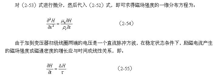 當(dāng)有一個(gè)直流脈沖電壓加到變壓器初級(jí)線圈的兩端時(shí),在變壓器初級(jí)線圈中就就有勵(lì)磁電流通過,并在變壓器鐵芯中產(chǎn)生磁場(chǎng)強(qiáng)度H和磁通密度B,兩者由下式?jīng)Q定: