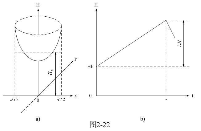 圖2-22-a和圖2-22-b是圓柱形鐵芯中磁場(chǎng)強(qiáng)度按水平分布的函數(shù)H(x,y)曲面圖和按時(shí)間分布的函數(shù)H(t)曲線圖。