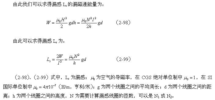 如果我們拿(2-99)式與(2-67)式或(2-94)式進(jìn)行對比,可以看出,線圈漏感與線圈的電感是沒有本質(zhì)區(qū)別的,只是磁路和磁通密度以及介質(zhì)導(dǎo)磁率等參數(shù)需要根據(jù)實際情況來決定。