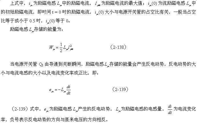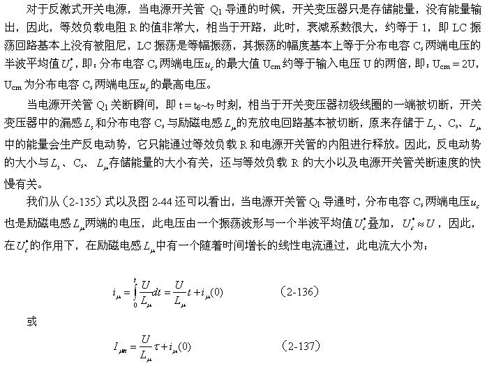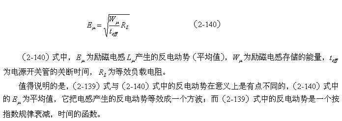 (2-140)式對于計算漏感 產生的反電動勢或其它電感產生的反電動勢同樣有效。漏感 中存儲的能量可根據(jù)(2-138)式求得;而流過漏感 的電流,對于反激式開關電源:可認為與勵磁電流的大小基本相等,因為,在反激式開關電源中,等效負載電阻等于無限大;對于正激式開關電源:可認為與流過等效負載電阻的電流大小基本相等,因為,在正激式開關電源中,勵磁電流相對于流過等效負載電阻的電流,很小。
