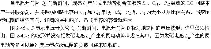 圖2-47中的D1、R1、C1是抑制漏感以及勵磁電感產生反電動勢和振鈴電壓幅度的有效電路。當變壓器初級漏感以及勵磁電感產生反電動勢時,反電動勢通過二極管D1對電容器C1進行充電,相當于電容器把反電動勢的能量吸收掉,從而降低了反電動勢和振鈴電壓的幅度。