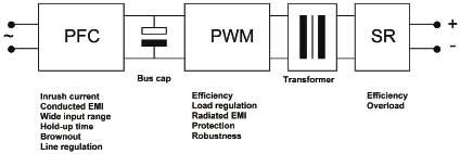 脈寬調(diào)制級(PWM)是主要的轉(zhuǎn)換器級。其中DC電壓被斬波為更高頻率的方波,因此利用更小的變壓器就可以轉(zhuǎn)換到另一個(gè)電壓級并提供隔離。并非所有的拓?fù)涠疾捎谜伎毡茸兓姆讲?,有些拓?fù)洳捎玫氖亲冾l,還有的則是改變兩個(gè)脈沖序列之間的相位。這一級主要確定轉(zhuǎn)換器的效率和負(fù)載調(diào)節(jié)。轉(zhuǎn)換器效率十分重要,首先它關(guān)系電源的運(yùn)行成本;其次是必須通過機(jī)箱冷卻來散除產(chǎn)生的熱量;第三是熱組件越大,就越昂貴,占用空間也越大。這三個(gè)因素與電源的使用壽命成本關(guān)系重大。