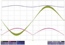 此外,它的功率要求很低,既提高了效率也降低了組件成本。該P(yáng)FC還帶有峰值限流、輸入電壓中斷保護(hù)功能,還有一個(gè)過壓比較器,可在發(fā)生負(fù)載突然減小事件時(shí)關(guān)斷PFC部分。時(shí)鐘輸出信號可用來同步下游的PWM級,以減少系統(tǒng)噪聲。圖3中,綠色曲線的較厚區(qū)域代表電流紋波,PFCIC在峰值輸入電壓下消耗電流較多,過零時(shí)沒有電流。粉色曲線代表整流器輸入電壓,藍(lán)色曲線為輸出電壓。